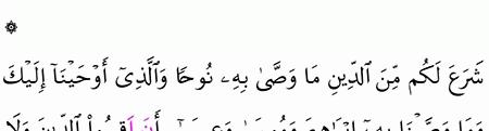 ش ر ع ل ك م م ن الد ين م ا و ص ى ب ه ن وح ا و ال ذ ي أ و ح ي ن ا إ ل ي ك و م ا و ص ي ن ا ب ه إ ب ر اه يم و م وس ى و ع يس ى أ ن أ ق يم وا الد ين و ل ا ت ت ف ر ق وا ف يه ك ب ر ع ل ى ال م ش ر ك ين م ا ت د ع وه م إ ل ي ه الل ه