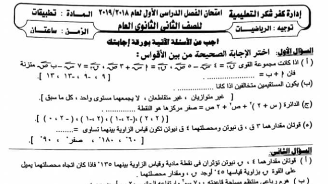 ورقة امتحان تطبيقات الرياضيات للصف الثاني الثانوي ترم اول 2019 ادارة كفر شكر التعليمية
