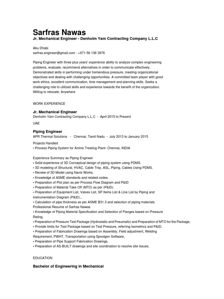 Sarfras Nawas Jr Mechanical Engineer Denholm Yam Contracting Company L L C Pipe Fluid Conveyance Technical Drawing